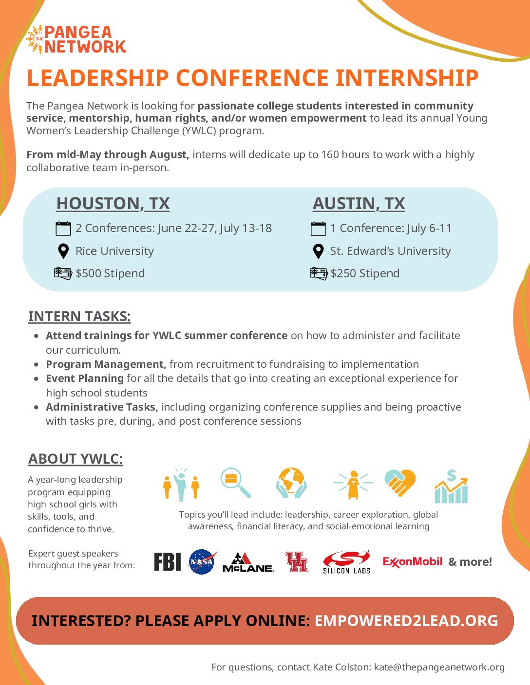 This summer, conferences will take place in Austin and Houston, offering interns the opportunity to support young leaders across Texas.