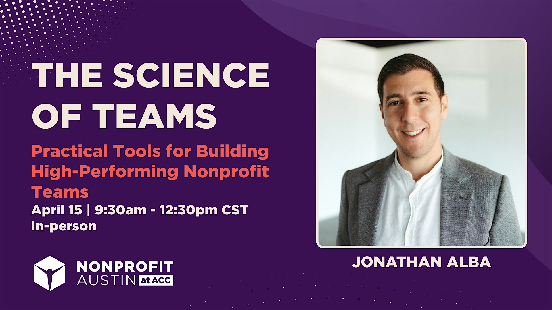 The link to the session will be sent to you from Nonprofit Austin at ACC, noreply@event.eventbrite.com, 1 day before the event. If you registered after that or the day of the event, you will receive the link to the session 1 hour before the event.